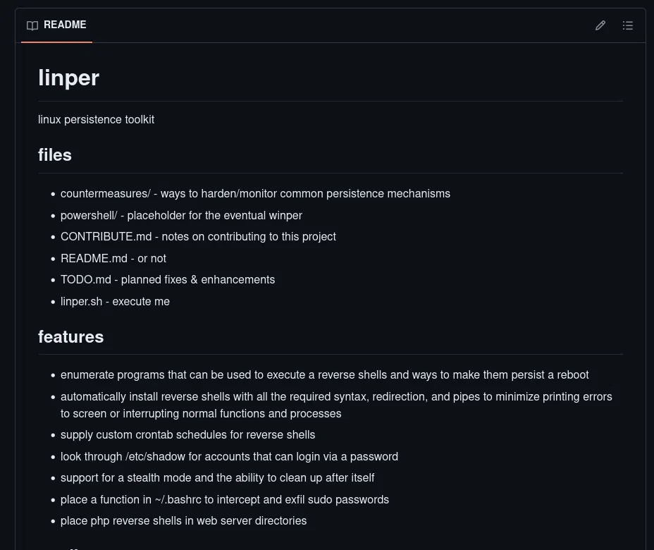 Il s'agit d'une boîte à outil de persistance ("persistence toolkit") pour les OS Linux, il vise à proposer plusieurs méthodes de persistance pour s'implanter de façon durable sur un système Linux compromis.