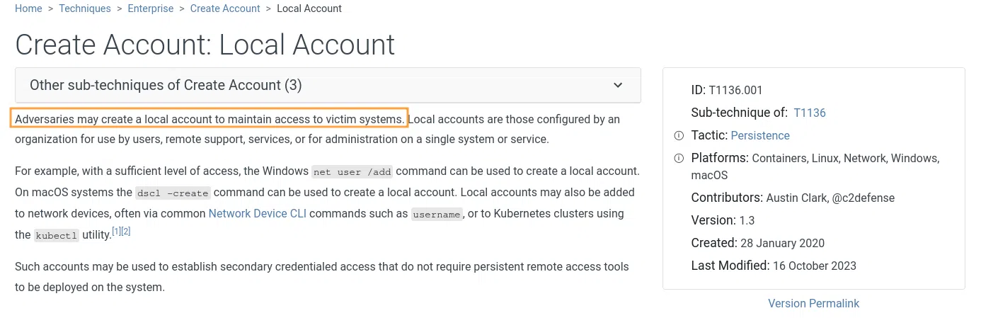 Après avoir parcouru les différents TTP de cette "Tactic", il semble ici que ce soit le TTP 1136.001 qui corresponde le mieux à notre situation :