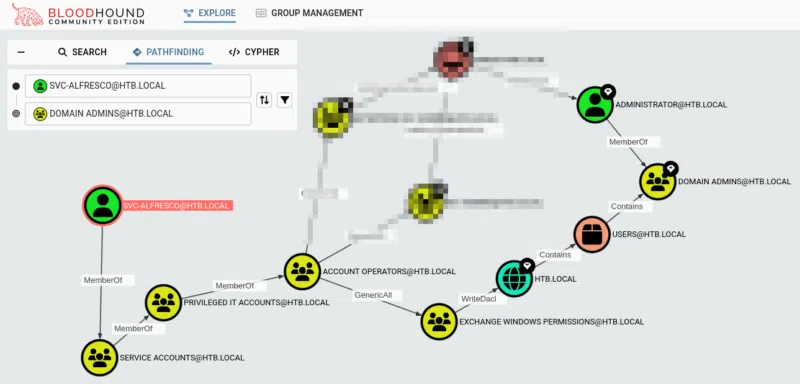 Recommandation n°5 : enfin, il est recommandé de corriger les chemins d'attaque présents au sein de l'Active Directory. Il s'agit notamment de l'appartenance indirecte au groupe "ACCOUNT OPERATORS" de l'utilisateur "HTB.LOCAL\SVC-ALFRESCO" et des groupes intermédiaires. Sur tous les annuaires Active Directory et tout système d'information, il est recommandé de rechercher de manière proactive les chemins d'attaque pouvant mener à la compromission du domaine.