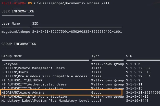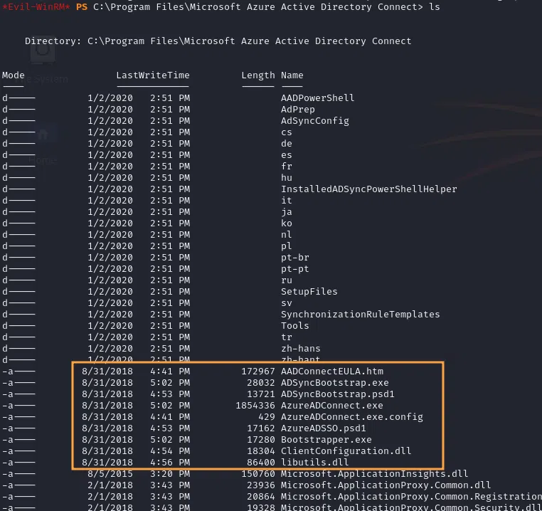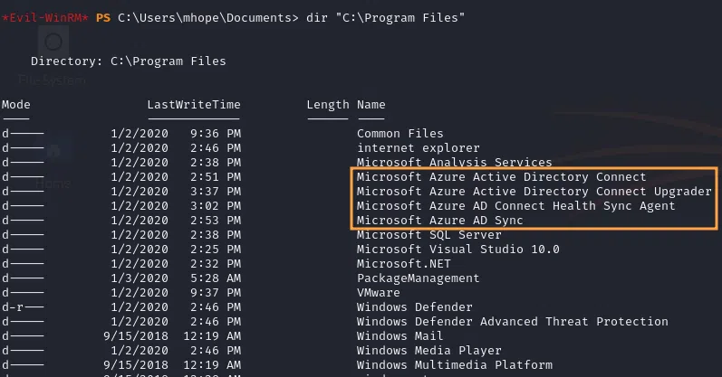 *Evil-WinRM* PS C:\Users\mhope\Documents> cd "C:\Program Files\Microsoft Azure AD Sync\bin"