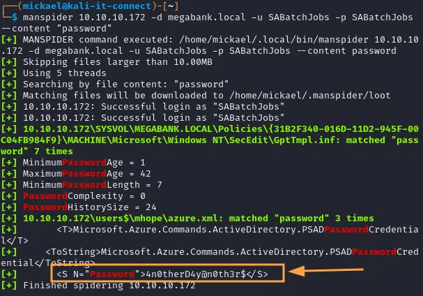 manspider 10.10.10.172 -d megabank.local -u SABatchJobs -p SABatchJobs --content "password"