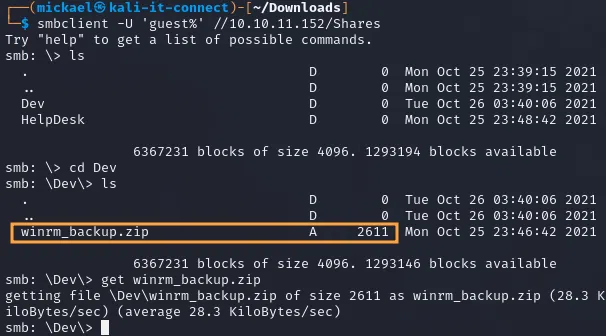 | T1083 - File and Directory Discovery | Recherche de fichiers sensibles dans le partage de fichier via smbmap. Téléchargement d'une archive ZIP |