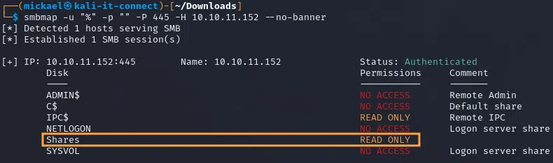 $ smbmap -u "%" -p "" -P 445 -H 10.10.11.152 --no-banner