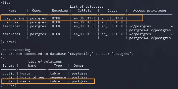 app@cozyhosting:/app$ psql -h 127.0.0.1 -U postgres -c "\list"
