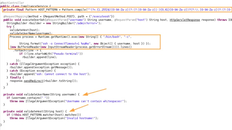 Nous voyons ici l'utilisation de "Runtime.getRuntime().exec()" pour exécuter des commandes système en Java. Également, on remarque les fonctions "validateUserName", qui vérifie simplement la présence d'un espace, et "validateHost", qui repose sur une expression régulière et un pattern plus complexe (je n'ai pas précisément étudié le pattern), ce qui correspond à nos observations "boite noire" (sans le code sous les yeux).