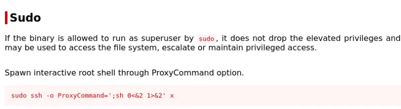 Intéressant, cet utilisateur peut exécuter la commande SSH en tant que root. Nous pouvons utiliser la ressource gtfobins.sh pour connaitre les éventuels abus existant sur cette commande : https://gtfobins.github.io/gtfobins/ssh/#sudo