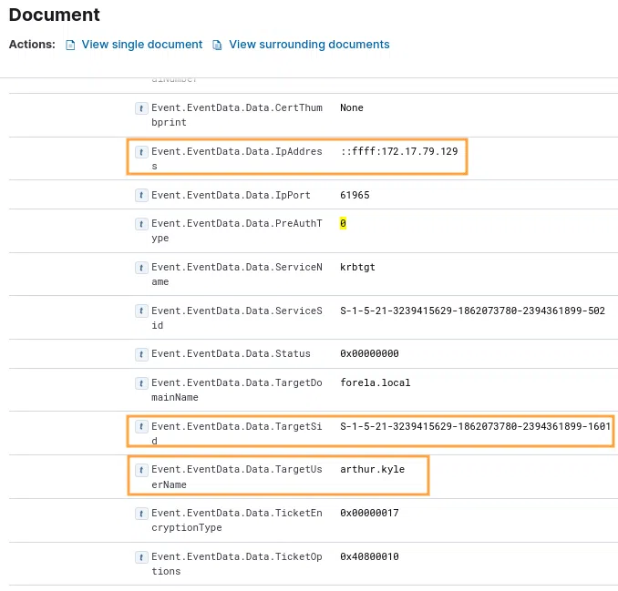 Nous retrouvons le nom de l'utilisateur pour lequel la demande de TGT a été faite, mais aussi son SID (Security Identifier) ainsi que l'adresse IP du poste source de la demande. Ce qui est intéressant pour remonter la chaîne de l'attaque.