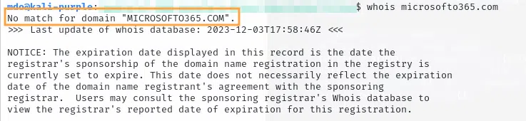 Il est à noter que, contrairement à ce que l'on pourrait penser, le nom de domaine microsofto365.com n'appartient pas à Microsoft, dans la réalité, personne ne possède ce nom de domaine :