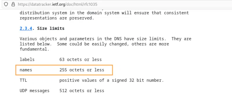 Également, la mise en place de règles de détections basées sur un volume anormalement élevé de requête DNS ou la taille de noms de domaine peut être recommandé. Il faut savoir qu'un nom DNS a une taille maximale de 255 caractères :