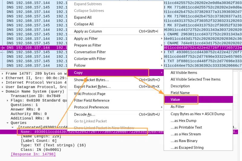 Voilà qui nous rappelle quelque chose : de l'hexadécimal. Je récupère au hasard une requête TXT et copie le contenu de la requête via la fonction Copy Value de WIreshark (pensez à bien faire un clic droit sur le champ exact à copier dans le paquet ciblé) :