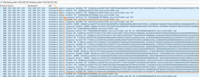 Ces échanges paraissent pour le moins inhabituels. Les noms DNS sont la plupart du temps intelligibles, et ils ne sont jamais aussi long. Ici, ils semblent être constitués uniquement des alphabets suivants avec aucun mot intelligible à part "microsofto365.com" :