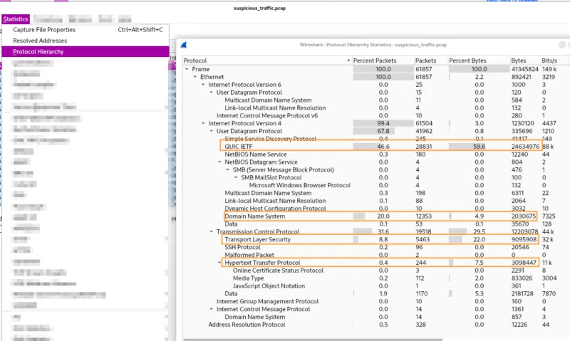 La première tâche consiste à identifier le protocole qui semble avoir été utilisé pour la réalisation de l'attaque. Wireshark nous permet d'avoir des statistiques intéressantes concernant la volumétrie des protocoles au sein d'un même fichier ".pcap" :