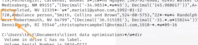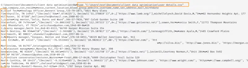 Nous voyons que l'attaquant a consulté le fichier "C:\users\test\documents\client data optimisation\user details.csv" et que celui-ci contient des informations personnelles :
