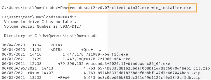 L'attaquant aurait tenté de renommer son outil une fois déposé sur le système compromis, nous pouvons de nouveau facilement repérer ses tentatives dans les échanges client-serveur "dnscat2" décodés :