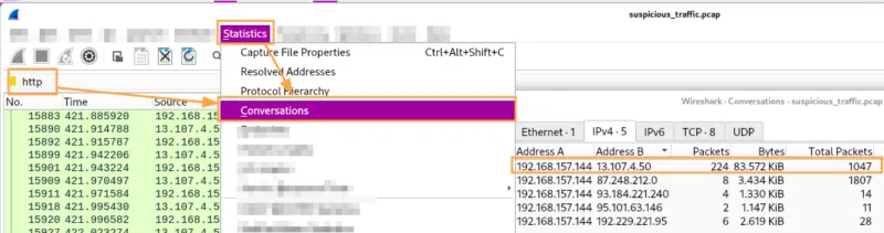 Si l'on effectue un filtre sur le protocole HTTP avec la fonctionnalité "Conversations" de Wireshark, nous pouvons très rapidement isoler les hôtes avec lesquels des échanges HTTP ont eu lieu :