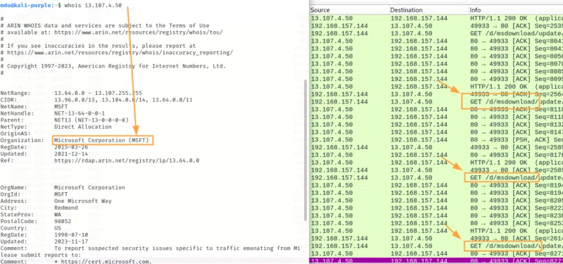 Notre hôte compromis à interrogé un point d'entrée "/msdownload/" sur une adresse IP appartenant à Microsoft. De toute évidence, il s'agit d'échanges en rapport avec les mises à jour Windows.