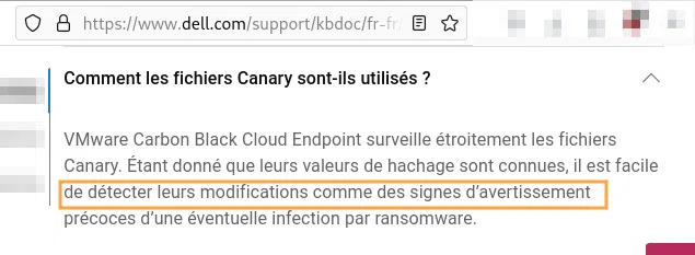 Il est cependant intéressant de noter qu'il existe des EDR (Endpoint Detection and Response) et EPP (End-Point Protection) qui créent et surveillent des fichiers canary sur le système de fichier. Il s'agit de fichiers "piégés" : si ces fichiers sont modifiés, alors l'EDR en déduit qu'il s'agit forcément d'un ransomware, il émet une alerte critique et tue le processus lié à la modification. Cela permet d'alerter les équipes de sécurité et de limiter l'impact d'un ransomware.