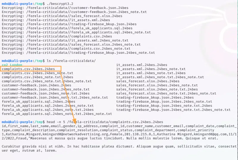 Nous retrouvons plusieurs chaînes de caractères intelligibles, probablement des valeurs écrites en dur dans le code du malware : des extensions, des messages d'erreur et le texte annonçant la rançon. Si l'on s'intéresse à la chaîne de caractère juste après "Encrypting: %s" (probablement une information affichée sur le terminal lors de l'exécution), nous avons les chaînes de caractère bhUlIshutrea98liOp, puis /forela-criticaldata/. Ce nom de dossier est celui qui nous a été fourni et qui contient les fichiers chiffrés. Visiblement, il s’agissait d'un dossier situé à la racine du système attaqué, l'attaque semble donc avoir été préparée à l'avance, pour chiffrer un dossier bien précis. Il est également intéressant de noter la présence d'une liste d'extensions.