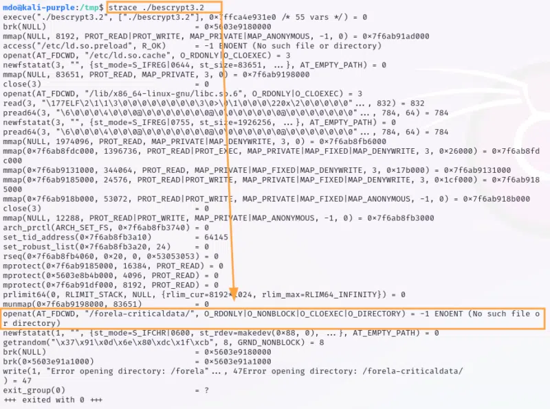 Visiblement, le malware cherche le dossier /forela-criticaldata/ et cesse tout simplement de s'exécuter s'il ne le trouve pas. Pour aller un peu plus loin dans le détail des actions réalisées, nous pouvons utiliser la commande strace qui va nous afficher les syscalls utilisés par notre binaire.