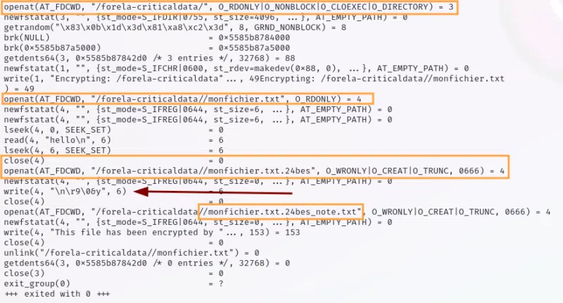 Le binaire accède au dossier ciblé puis affiche le message "Encrypting ...", il accède au fichier monfichier.txt en lecture seule (O_RDONLY), probablement pour récupérer son contenu. Il ferme ce fichier (close) puis le réouvre avec les flags suivants :