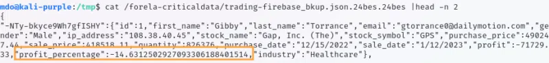 Des suspicions d'opérations financières anormales ont été détectées. La première étape pour résoudre cette tâche consiste à identifier dans quel fichier se trouve ce type d'information. Si l'on regarde les attributs JSON du fichier trading-firebase_bkup.json, on remarque la présence d'un profit_percentage :