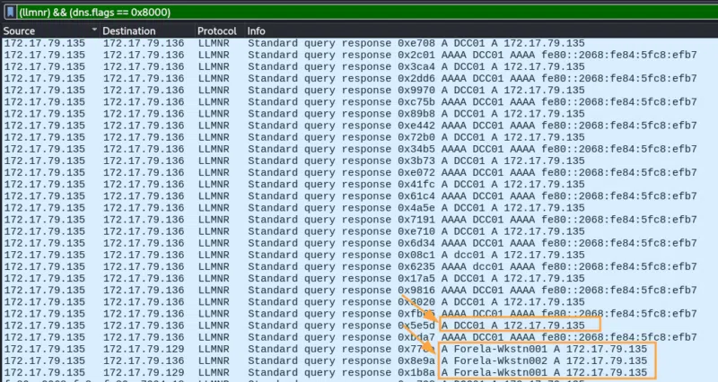 Attardons-nous un peu sur les premiers éléments identifiés grâce à notre filtre, notamment la partie entourée en Orange. Dans un réseau d'entreprise, il n'est pas possible qu'un hôte ait deux noms DNS pour une même adresse IP. Hors si l'on regarde avec attention certaines des réponses LLMNR, on remarque que c'est ce que l'hôte "172.17.79.135" prétend. Il indique que son IP correspond à la fois à "DCC01", à "Forela-Wkstn001" et à "Forela-Wkstn002". C'est un indicateur fort qu'il tente de répondre à des requêtes LLMNR d'autres hôtes du réseau en souhaitant se faire passer pour tous les hôtes recherchés.