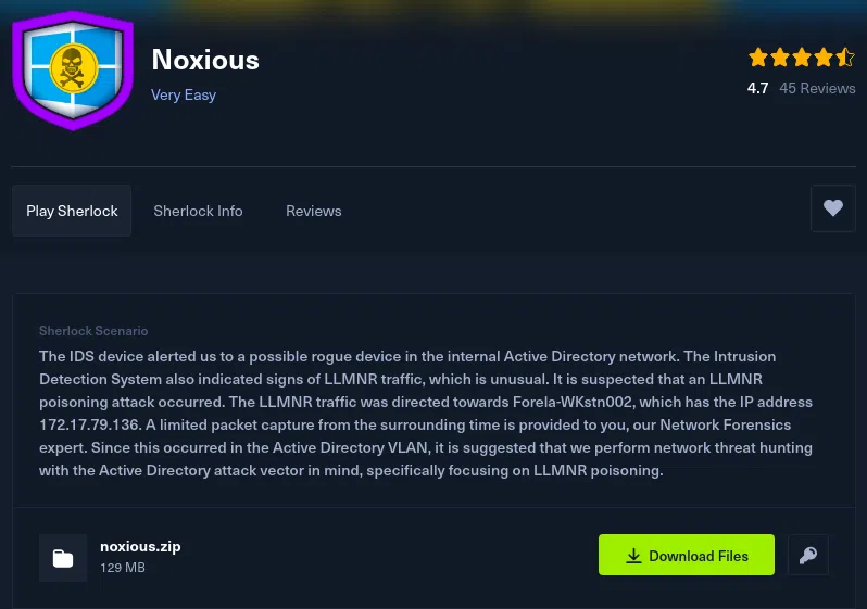 On se retrouve dans cet article pour une nouvelle solution de l'un des challenges d'investigation numérique/forensic nommés Sherlocks et mis à disposition par la plateforme Hack The Box. Dans cet article, nous allons détailler la démarche qui permet de résoudre le Sherlocks Noxious, de difficulté "débutant". Il s'agit d'investiguer sur les traces d'une cyberattaque ciblant un système d'exploitation Windows et un domaine AD via les protocoles LLMNR et SMB2.