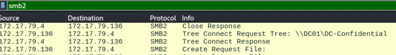 On peut noter que le poste de la victime échange ici avec le serveur "172.17.79.4", il s'agit probablement du vrai DC du système d'information.