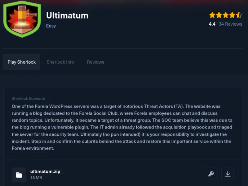 On se retrouve dans cet article pour une nouvelle solution de l'un des challenges d'investigation numérique/forensic nommés Sherlocks et mis à disposition par la plateforme Hack The Box. Dans cet article, nous allons détailler la démarche qui permet de résoudre le Sherlocks Ultimatum, de difficulté "débutant". Il s'agit d'investiguer sur les traces d'une cyberattaque ciblant un serveur Linux via la compromission d'un site WordPress