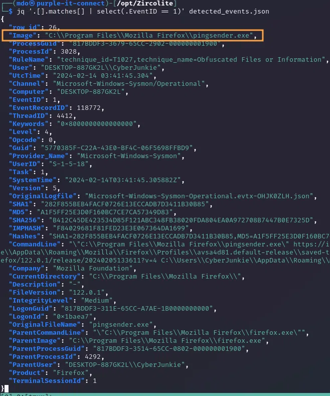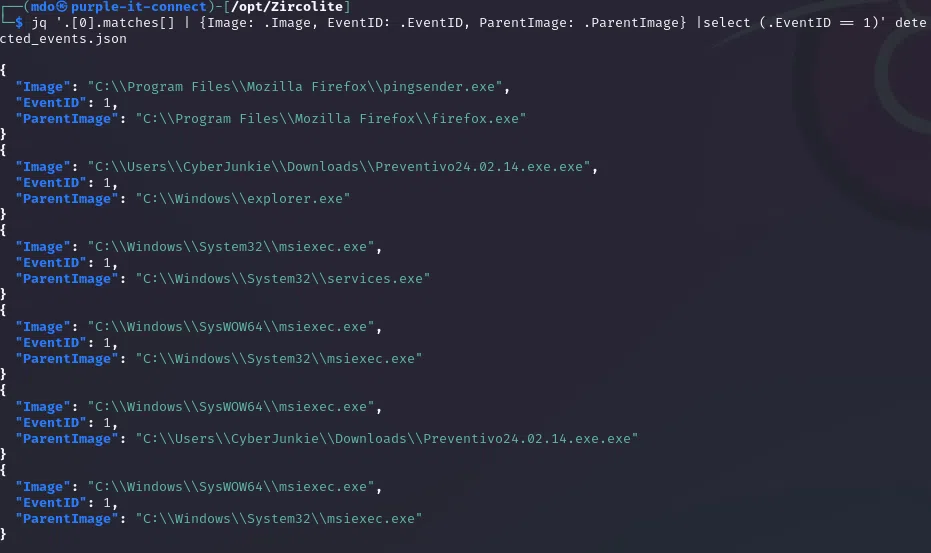 jq '.[].matches[] | select(.EventID == 1)' detected_events.json