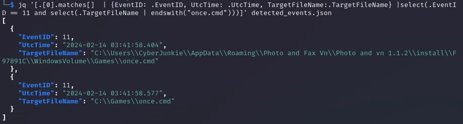 jq '[.[0].matches[] | {EventID: .EventID, UtcTime: .UtcTime, TargetFileName:.TargetFileName} |select(.EventID == 11 and select(.TargetFileName | endswith("once.cmd")))]' detected_events.json