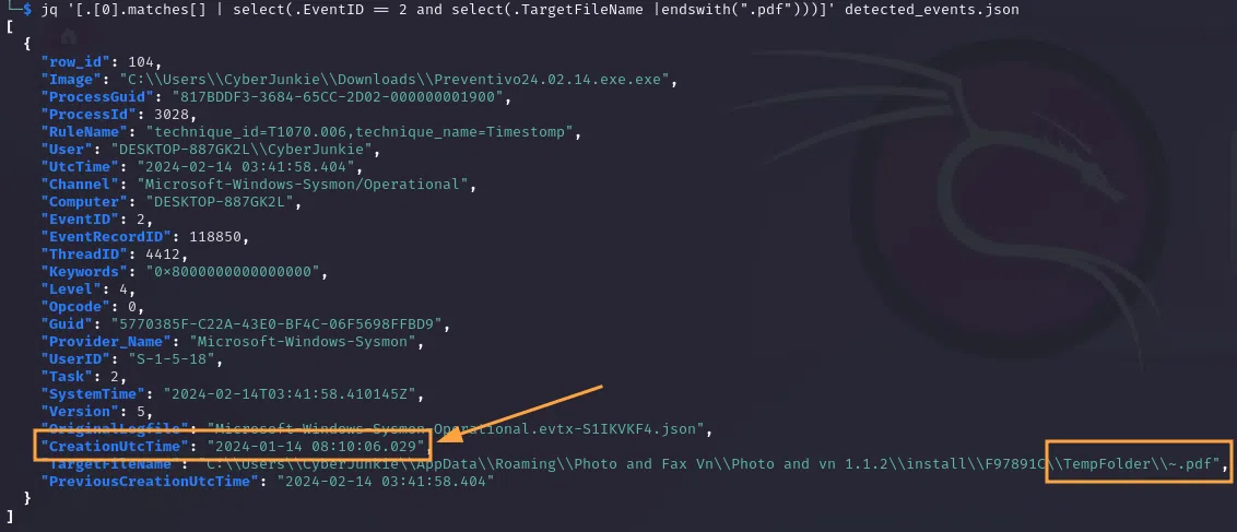 jq '[.[0].matches[] | select(.EventID == 2 and select(.TargetFileName |endswith(".pdf")))]' detected_events.json