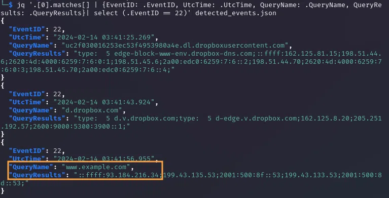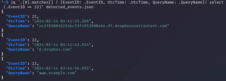 jq '.[0].matches[] | {EventID: .EventID, UtcTime: .UtcTime, QueryName: .QueryName}| select (.EventID == 22)' detected_events.json
