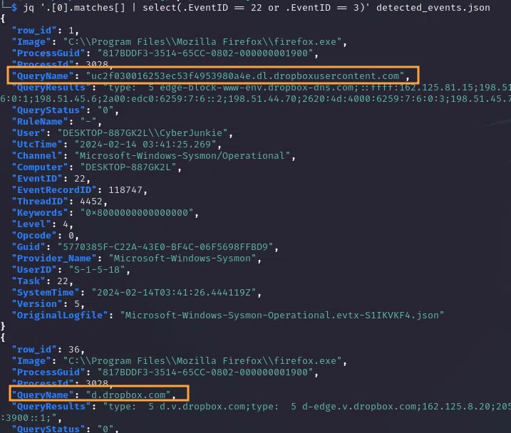 jq '.[0].matches[] | select (.EventID == 22 or .EventID == 3)' detected_events.json