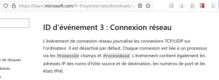 Notre objectif est d'identifier une plateforme Cloud que l'attaquant aurait été susceptible d'utiliser pour la distribution de son malware. Nous pouvons rechercher dans les journaux les évènements relatifs à des connexions réseau. La documentation des évènements Sysmon peut nous aider :