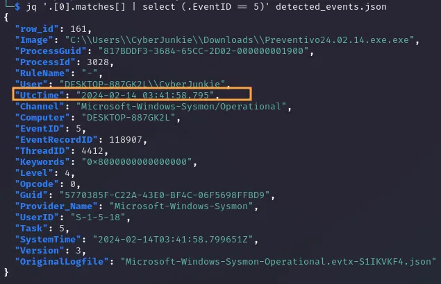 Nous reconnaissons le nom du processus incriminé et pouvons récupérer l'heure exacte à laquelle il s'est terminé : 2024-02-14 03:41:58.