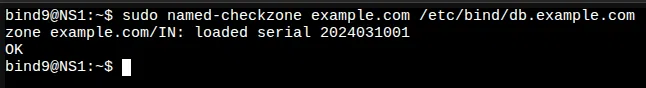 sudo named-checkzone example.com /etc/bind/db.example.com