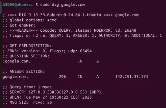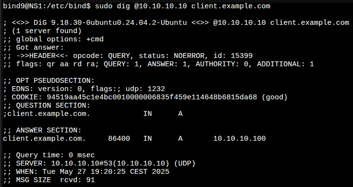 Si la configuration est correcte, vous devez obtenir une réponse dans la section ANSWER avec l’adresse IP associée à client.example.com.