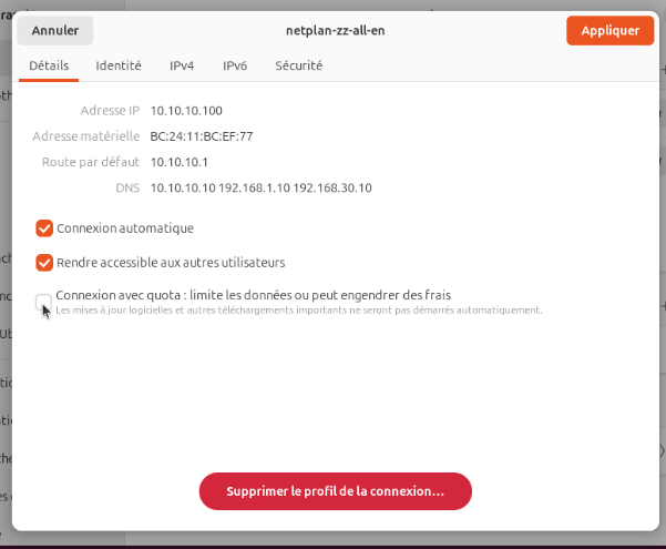 Sur la machine Ubuntu (client.example.com), je vais configurer les trois serveurs DNS dans les paramètres réseau. Ainsi, si l’un d’eux ne répond plus, la machine pourra tenter de résoudre les noms via les deux autres.