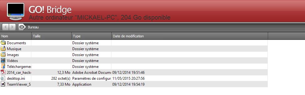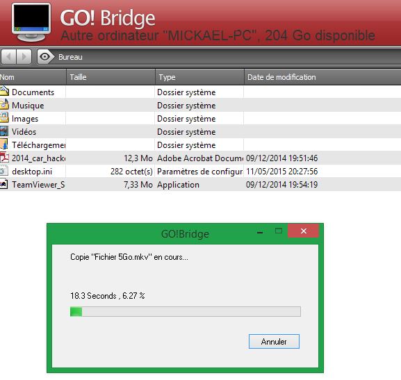 Pour vous donner un rapide aperçu, une fois que les PC sont reliés, on peut simplement transférer un fichier en faisant un copié/collé de l'un vers l'autre. On aura également accès à l'application GO! Bridge qui permet d'avoir un aperçu direct des répertoires de la machine reliée :
