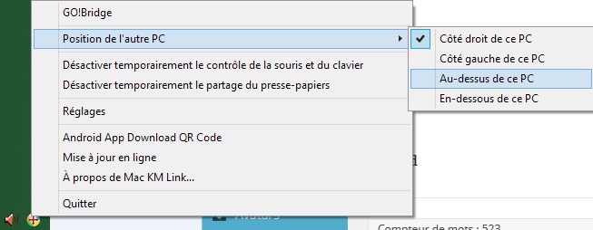 Outre l'échange de fichiers, diverses options permettent également la configuration du partage de la souris et du clavier, par exemple la position du deuxième PC par rapport au premier :
