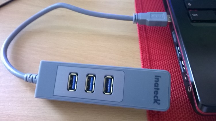 Aujourd'hui je vais vous parler d'un petit boitier plutôt pratique : le HB4009 d'Inateck. Ce boitier n'est en apparence qu'un hub USB, à savoir un boitier qui se branche en USB et qui se compose de plusieurs autres ports USB, voyez plutôt :
