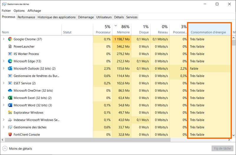 Microsoft a apporté une modification discrète mais intéressante à son gestionnaire des tâches. Ce dernier intègre une nouvelle colonne pour afficher la consommation d'énergie de chaque processus.