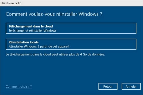 Si vous décidez de réinitialiser votre PC Windows 10, vous pouvez désormais choisir l'option "Téléchargement depuis le Cloud" cela va récupérer une copie de Windows 10 totalement à jour depuis Internet pour réinitialiser votre PC. D'ailleurs, Microsoft précise que cela peut être plus rapide que la réinitialisation à partir de l'image locale si vous avez une bonne connexion Internet. En effet, lorsque l'image locale est utilisée il faut déjà qu'elle soit reconstruite et ce processus peut s'avérer long et gourmand en ressources pour votre PC.