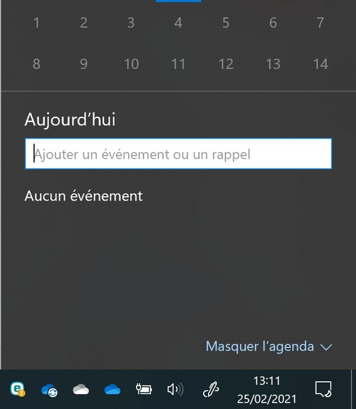 En cliquant sur la date et l'heure en bas à droite de l'écran, il est possible d'ajouter des événements dans le calendrier, sans avoir à passer par l'application.