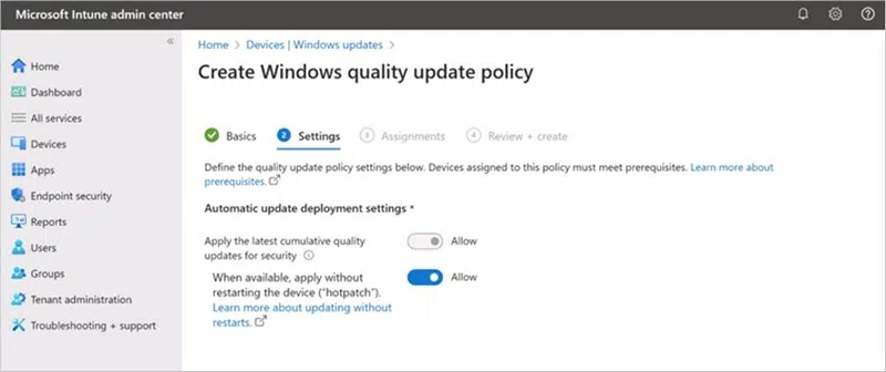 - Microsoft Intune pour gérer le déploiement des mises à jour via une stratégie pour Hotpatch.